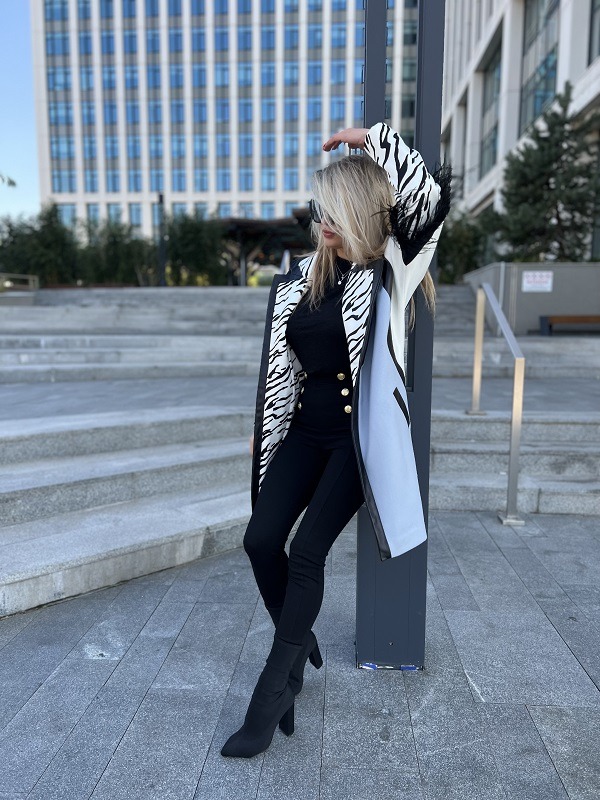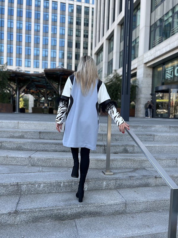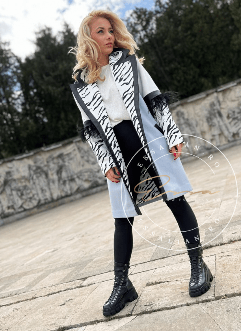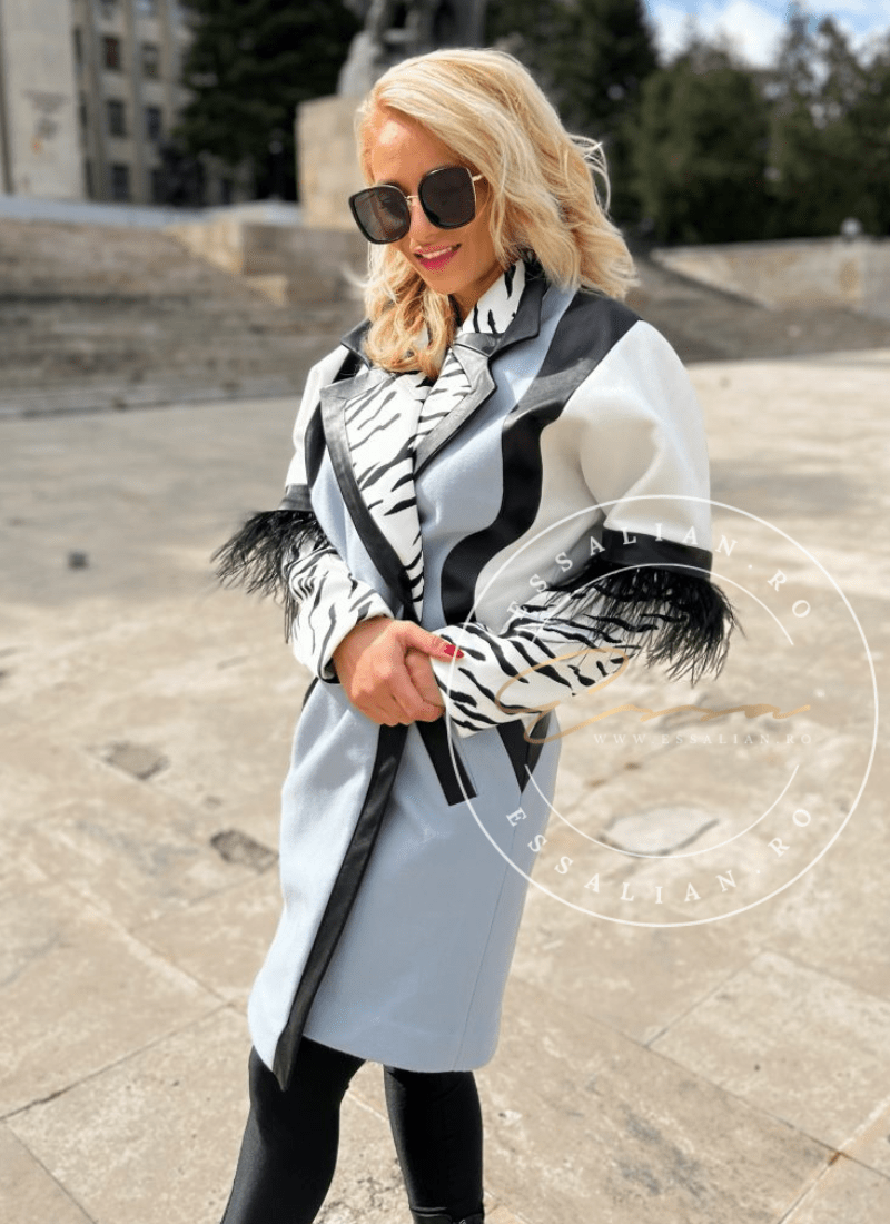 De exemplu, poti achizitiona acest palton stofa dama bleu, cu maneci raglan din stofa alba si insertii din piele naturala de capra. De asemenea, paltonul este prevazut cu pene de strut in zona manecilor, cu o captuseala din satin cu model zebra si cu buzunare laterale.