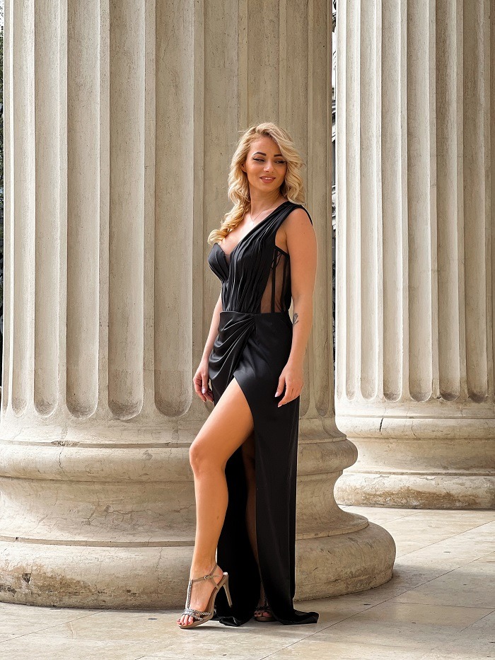 Cu aceasta rochie neagra lunga din tafta satinata, vei arata cu adevarat spectaculos.